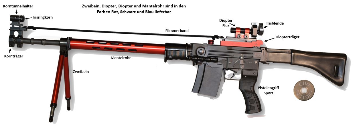Il est possible de monter des organes de visées de type Dioptre (Carabine ISSF) sur toutes les armes d’ordonnances autorisées ainsi que divers accessoires (voir la page sur les accessoires autorisés)