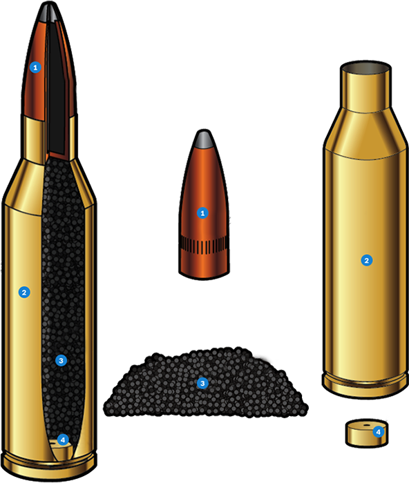 Une munition, c’est l’élément indispensable au fonctionnement d’une arme à feu. Elle est conçue pour propulser un projectile avec précision et puissance. Une cartouche moderne est composée de quatre éléments principaux, assemblés dans un seul cylindre métallique appelé étui :