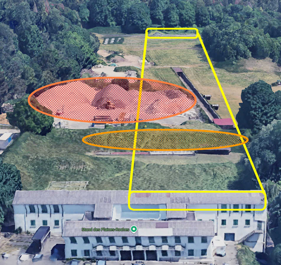 Ici nous avons la ligne de tir de Neuchâtel (en jaune) Cette ligne est superposée à celles des plus petits calibres. Elle tire donc par dessus la bute de sécurité prévue à cet effet (orange clair). Cette bute peut à la fois générer un vent plus fort à hauteur du tir mais également générer des turbulences en fonction du vent. Juste derrière cette bute, on retrouve une petite carrière qui forme de gros monticules de roche ou de sables (orange foncé) qui viennent également induire une imprécision pour toutes les lignes de tir se trouvant le plus à gauche.