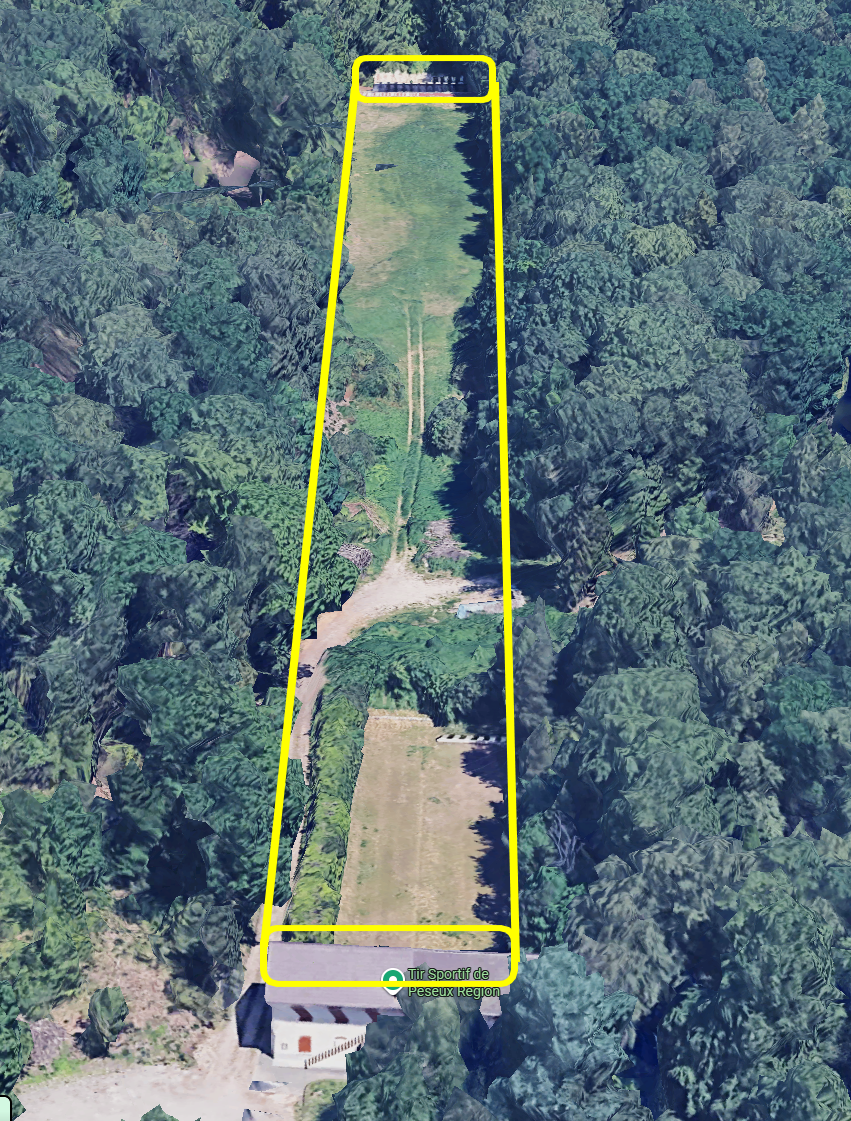 Prenons l’exemple de la ligne de tir 300m du stand de Lignières (NE). Cette ligne de tir commence dans un couloir d’arbres avant de traverser une zone dégagée dans un champs pour atteindre les cibles en bordure du champs, dos à la forêt.