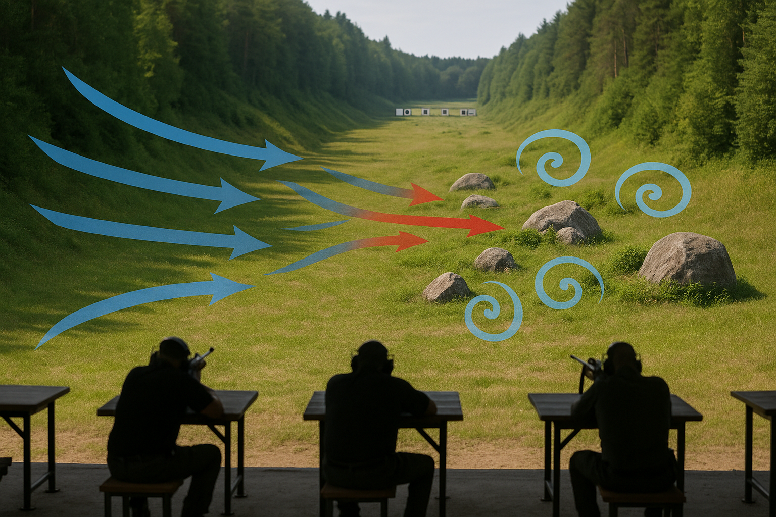 Les turbulences apparaissent lorsque le vent rencontre des obstacles (bois, bâtiments, buttes, structures de stand) ou des changements de température, créant des flux d’air chaotiques et imprévisibles. La balle traverse alors des micro-variations soudaines de direction et de pression, pouvant affecter la trajectoire de manière erratique, surtout sur les derniers mètres avant la cible où l’énergie résiduelle du projectile est plus faible. Contrairement aux vents réguliers, les turbulences ne se compensent pas avec une simple valeur de correction : elles exigent prudence, observation, tir au bon moment et parfois réduction du rythme de tir pour attendre une fenêtre stable.