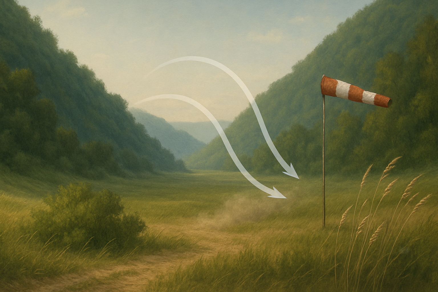 En vallée, l’air s’écoule le long du relief et peut s’accélérer légèrement, tout en gardant une trajectoire majoritairement prévisible. Pour le tireur, l’enjeu est de lire correctement le terrain et les indices visuels (herbe, fumée, mirage) et d’appliquer une correction constante, car ce type de vent reste stable mais impose une dérive latérale non négligeable sur les tirs longue distance.
