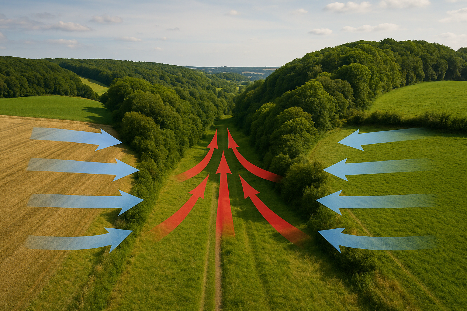 La brise de plaine et de vallée provoque un flux d’air régulier, généralement faible à modéré, orienté par les dénivelés naturels.